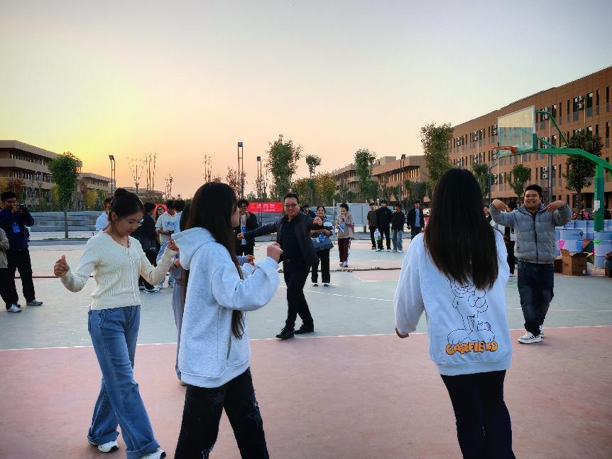 活动现场气氛热烈,师生自由组队、默契配合。拔河比赛中,师生紧握长绳、齐声呐喊,展现出“劲往一处使、心往一处想”的团结力量;套圈区前,教师与学生并肩排队,分享套取奖品的技巧,欢呼声与笑声此起彼伏;投壶场上,师生聚精会神、专心瞄准,每一个进球都引来共同喝彩;最热闹的当属舞蹈环节,师生跟着节奏起舞,大家沉浸在欢快的新疆特色音乐之中,在旋律中传递情谊。